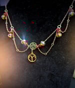 Copper chain with red and yellow iridescent beads with a decorative connector piece. Created to be lightweight wear necklace with a gold Aries pendant.