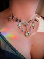 Silver chain and silver decorative connectors with sparkly and iridescent beads and gems to create a ornate yet elegant necklace.